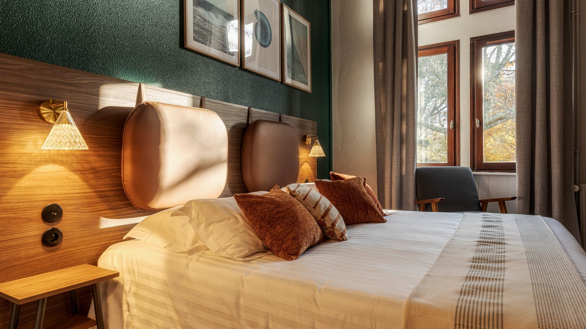 Dans les chambres, à travers la décoration, le choix des couleurs, du mobilier et des textiles, chaque détail raconte un morceau de l’histoire du domaine en toute humilité.